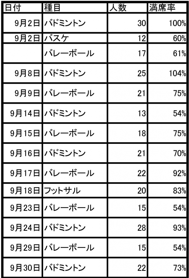 ※満席率については、それぞれ定員をバドミントン30名(コート2面の時は24名)、バレーボール28名(土日両方開催の時は21名)、フットサル24名、バスケ20名として算出しています
