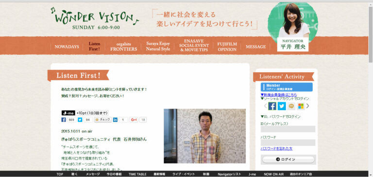 10/11(日)朝6時半から10分ほど、JWAVE「WONDER VISION」に代表の石井が生出演しました。 10/11(日)は体育の日の前日ということで、番組のテーマは「スポーツからワクワクする未来を考える」 街の声