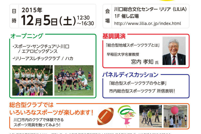 当日は、早稲田大学名誉教授による基調講演や川口市内の地域密着型スポーツクラブ運営メンバによる事例発表の他、川口市内のスポーツクラブで体験ができる様々なスポーツ用具に触れられたり、川口市中央地域包括支援センターオリジナル介